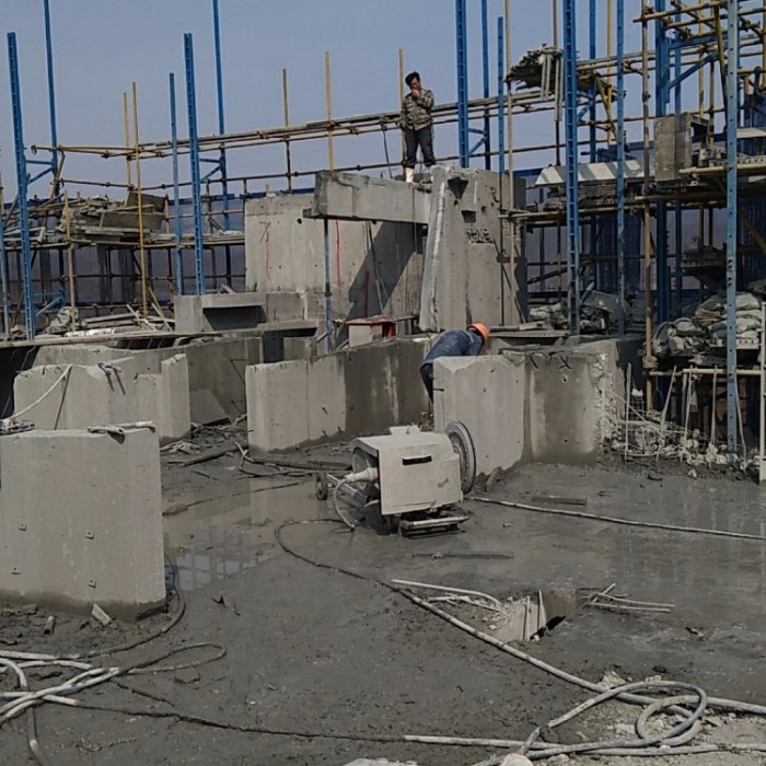 对于原钢筋混凝土结构,采用金刚石圆盘锯片切割,将原混凝土完全去除,分段、分块进行作业,切割时控制深度,不切割原始结构。对于原有复杂的混凝土结构,采用金刚石线锯切割和金刚石桶锯钻孔机钻孔切割相结合的方式。