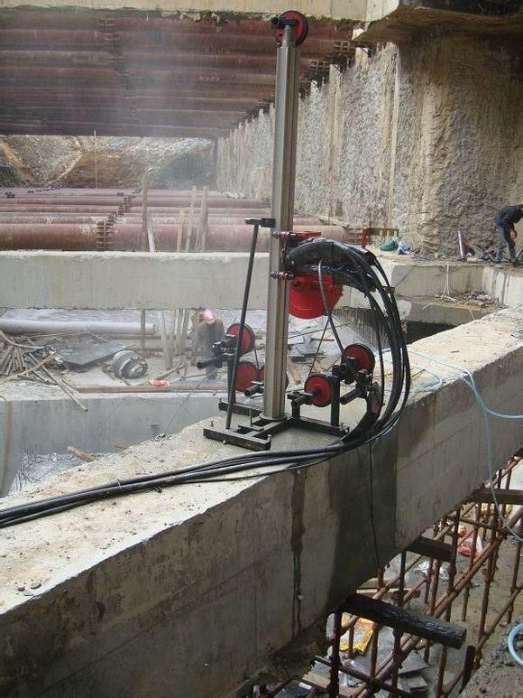 9、用理论伸长率计算张力时,应测量实际伸长率值,并与理论伸长率值核对。预应力筋理论伸长值计算公式: 式中: pp——预应力钢绞线的平均拉力(n) l——预应力钢绞线的长度(cm) ap——截面积预应力钢绞线的弹性模量(mm2) ep——预应力钢绞线的弹性模量(n/mm2)。假设有两种类型的张紧器:64、5 米和 52、5 米。张拉平台钢绞线有效长度=张拉平台长度+两根钢梁宽度+减压沙箱长度+两端锚杆长度64、5米,张拉有效长度平台钢绞线l=64、5+1、3+0、5 +0、1=66、4m 理论伸长值δl=×66、4×÷(1、95×)=.5m 钢绞线在张拉台上的有效长度l=52、5+1、3++0、1=54、理论伸长值δl=×54、24×÷(1、95×)=,预应力梁张拉施工采用一端固定,单向张拉:张拉顺序从中间向两侧对称进行,荷载进行分三个阶段出来。张紧操作人员应有3人,1人用钢尺测量钢绞线的实际伸长值,1人记录,1人操作油泵。整体张紧:在整体张紧端,用两个千斤顶推动活动锚箱进行整体张紧。为了在张拉过程中保持活动锚箱的平衡,采用两台千斤顶油路联动,同步顶升的方法。当张力达到80%时,由于千斤顶行程小,无法达到计算伸长值。需要在活动锚箱和固定锚箱之间使用大块来保持行程,千斤顶回油,在千斤顶下加两片。间隔,然后拉伸到 %。张紧完成后,用螺母锚定锚杆,将油回油到千斤顶,松开连接套,即可将活动锚箱和千斤顶移至另一条生产线张紧。首先检查油路是否正常,检查安全设施,确保人员安全。每个油泵的驱动器紧密配合,控制各自的油泵。当拉力达到%σk时,负载保持5分钟后回缩,再拉至%σk。标记股线,放松压力并重新紧张。张紧完成后,重新校准用于张紧的张紧机器和设备。观察并测量基座和压力柱。加钢塞做支撑,千斤顶卸荷,在承重箱和端梁之间插入不同粗细的钢塞,用细钢塞塞紧,使锚杆受力均匀,然后千斤顶卸载。钢绞线拉长后,将失效管密封,防止混凝土浇筑时混凝土浆料倒回失效管内,影响失效效果?;炷两街匦朐谡爬?8小时内完成。