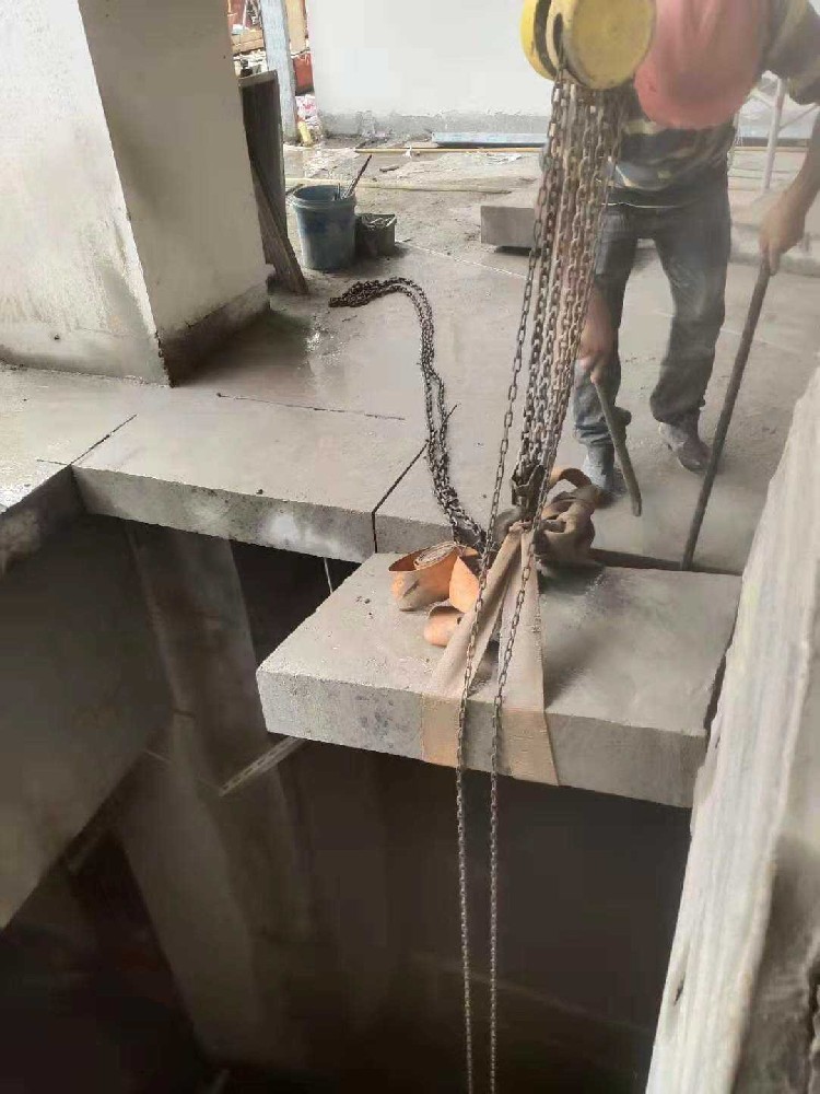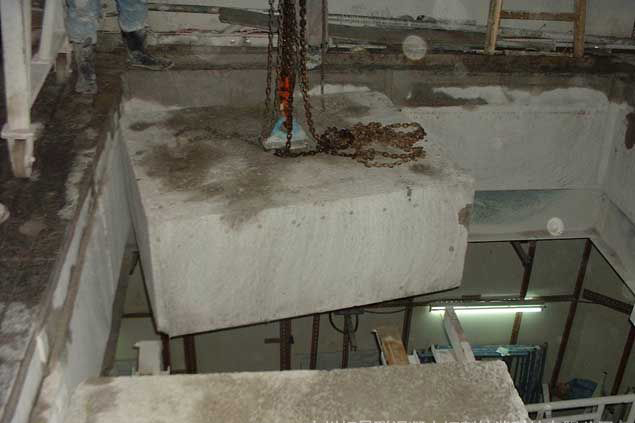 (4).主体结构楼板切割前,先用型钢做起吊龙门,吊架固定在横梁上。用钻孔机在要切割的楼板上均匀地钻4个孔,将钢丝绳穿过,然后挂在两个手拉葫芦的挂钩上?;炷燎懈詈蟮钠鹬睾胖迷诘跫苌稀?/span>