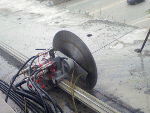 (3).地板外围用平推式电动切割机切割,中间部分用膨胀螺栓固定在待切割表面小切割机的轨道上,分块切割。