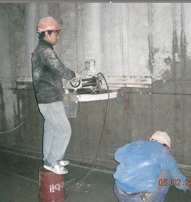 (1)、施工工艺:根据设计要求,必须对原结构混凝土墙体进行无振动切割,以免对原结构的破坏和干扰。针对这一要求,在切割施工中,使用水钻切割施工具有施工速度快、效率高、无振动、不会对整体建筑结构造成破坏等优点。