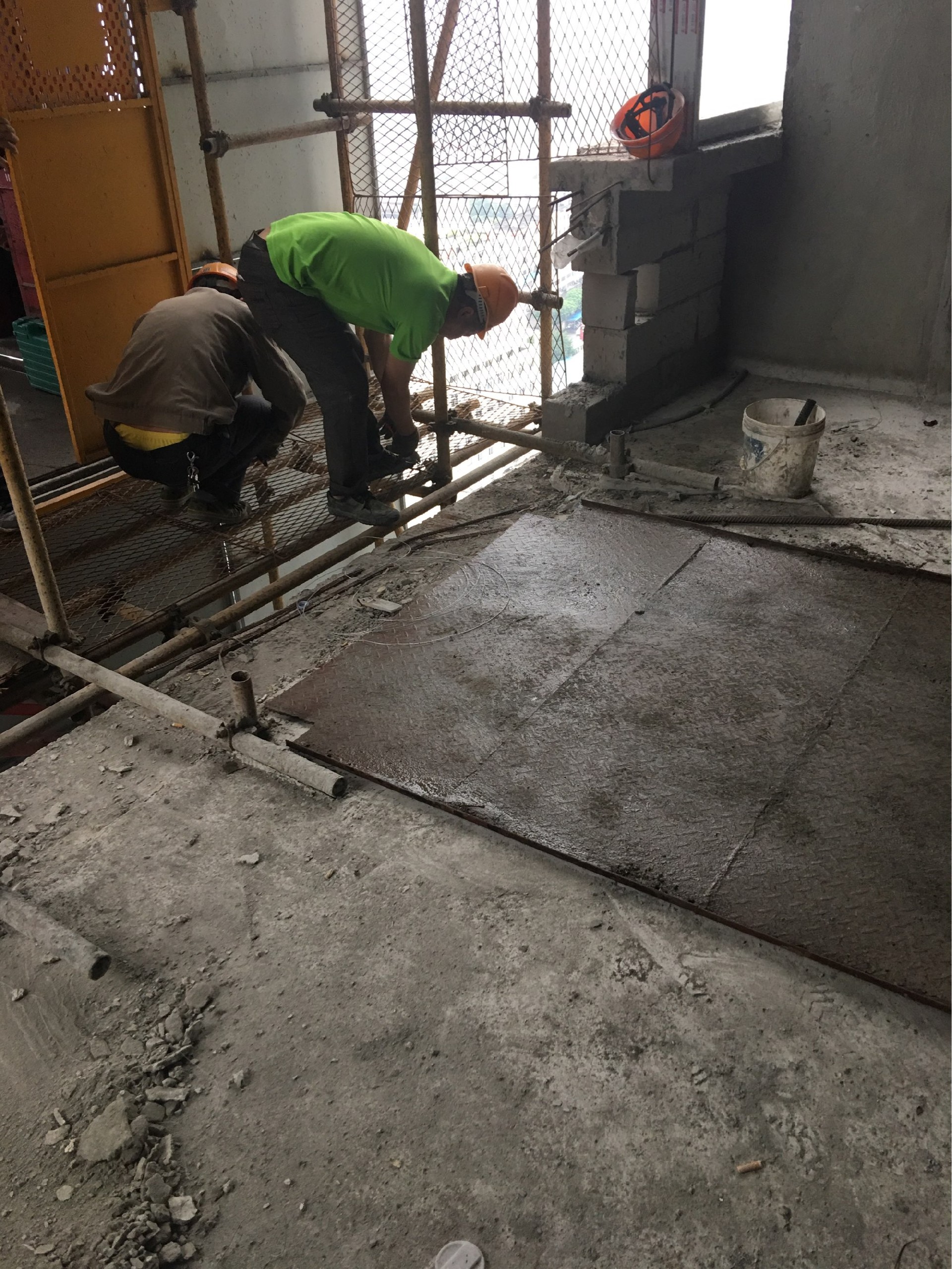 第二步,切割地板:使用专业拆除切割工具(墙锯、水钻切割机等)沿梁边缘和地板画红线方向切割,注意切割地板必须分块切割,手动移动或使用倒链吊装工具分割地板安全,沿红线方向切割地板到红线左侧,混凝土用电动工具破碎拆除剩余原地板钢筋,弯曲钢筋90度;