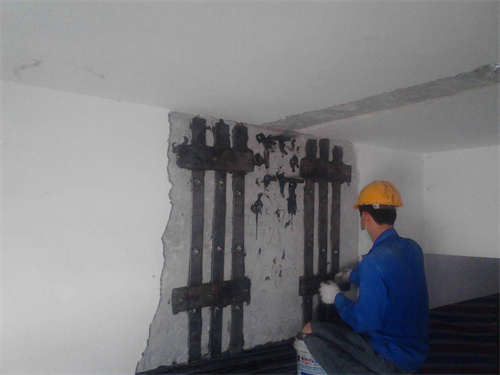 4.我们用记号笔在钢板上标出钻孔位置,然后用台钻钻孔。然后我们把钢板放在墙的相应位置,注胶安装螺栓固定。钢板与钢板应焊接牢固。钢板安装后,可安装模板灌注灌浆材料,使钢板与墙体形成一个整体。
